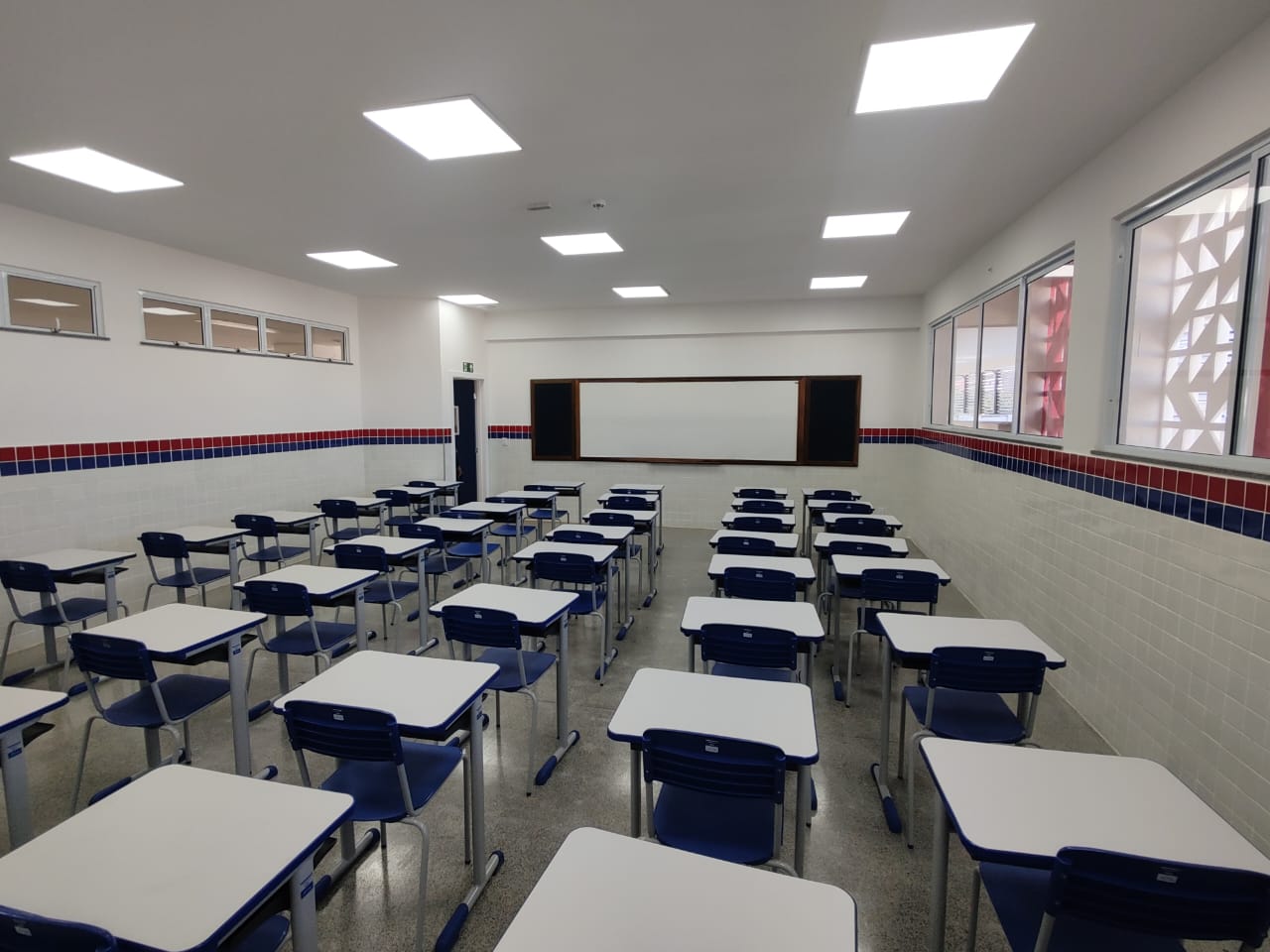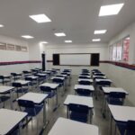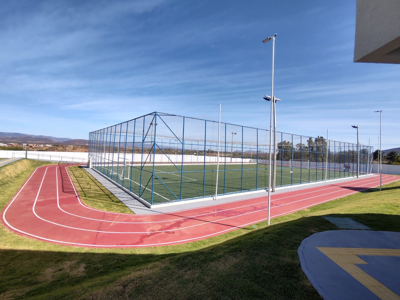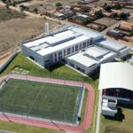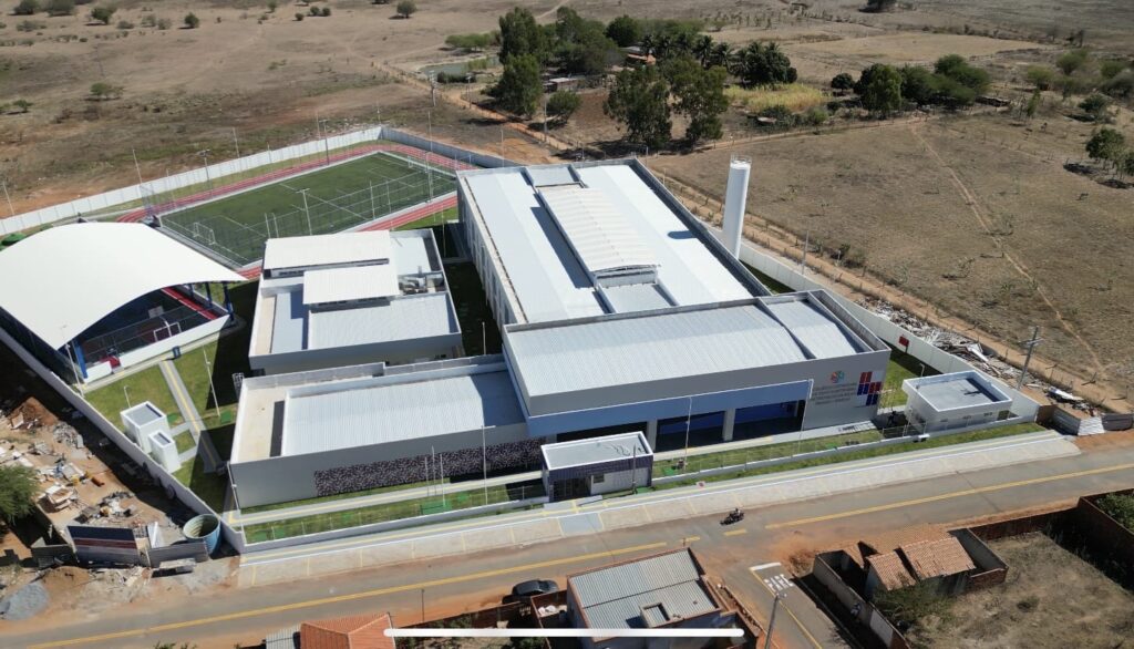 Construção de escola de tempo integral com: 12 salas de aula, incluindo teatro, restaurante, campo de futebol society, pista de corrida e quadra poliesportiva coberta.